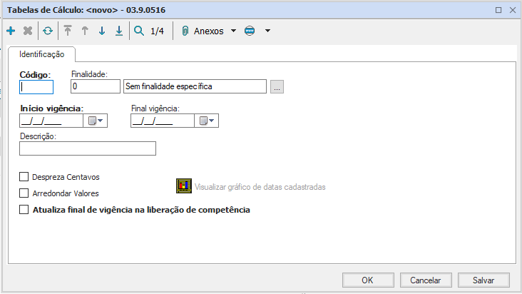 0 – sem finalidade específica: Tabelas de cálculo criadas com essa finalidade são utilizadas em cálculos de eventos gerais, de acordo com a necessidade do usuário;