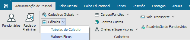 É o cadastro utilizado para valores de tributos com valores fixos, como salário família, salário mínimo, desconto mínimo de imposto de renda, entre outros. Para realizar o Cadastro dos Valores Fixos, selecione a opção “Cálculos- Valores Fixos”