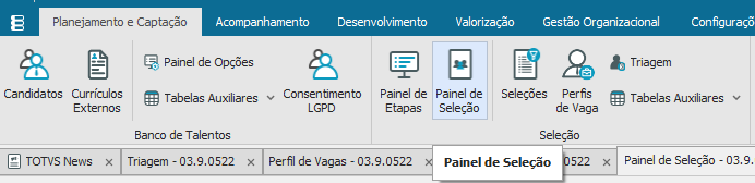 O cadastro do Painel de Seleções, está localizado no “Módulo RH- Gestão de Pessoas” aba “Planejamento e Captação” opção “Painel de Seleção”