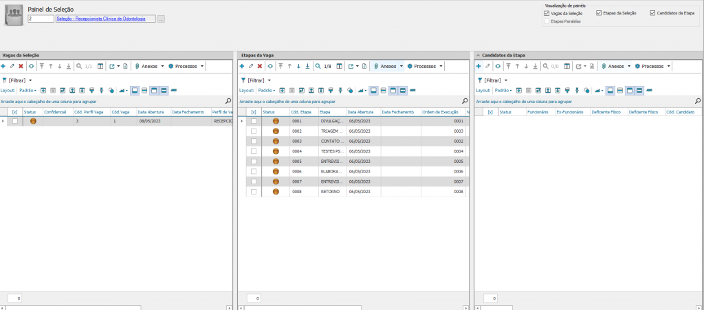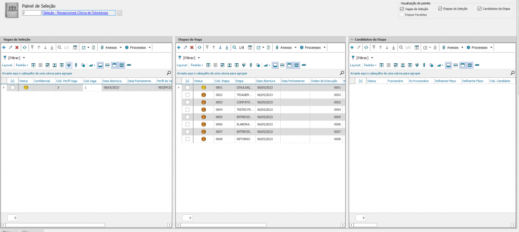 - Candidatos da etapa: Exibe os candidatos inscritos na seleção exposta no Painel;
