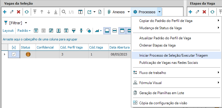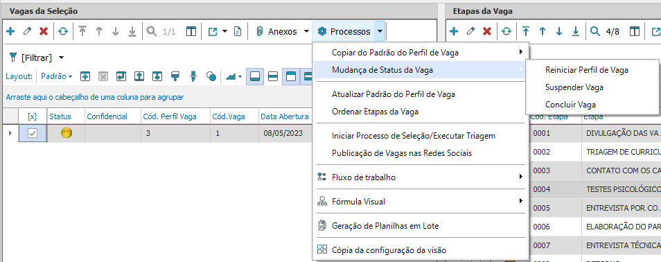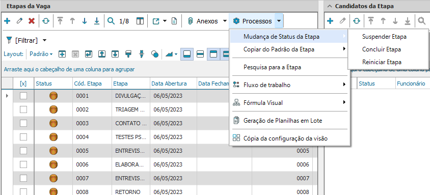 Tanto na tela de vagas da seleção, quanto na tela de etapas da vaga, é possível alterar o status da etapa utilizando os processos.