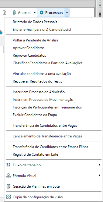 – Alterar status do candidato na etapa: Esse assistente pode alterar o status do candidato e eliminá-lo em uma etapa e pode ser executado para vários candidatos ao mesmo tempo;