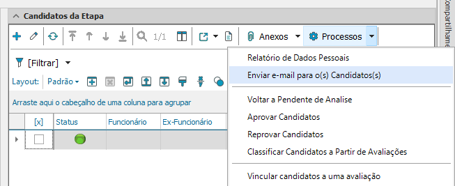 É possível enviar um e-mail para um ou mais candidatos selecionados diretamente da tela de “Candidatos da Etapa”