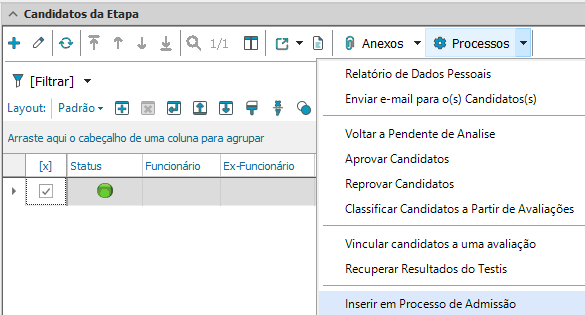 Ao chegar à última etapa do processo de seleção e estiver(em) definido(s) o(s) candidato(s) que será(ão) contratado(s), é necessário realizar o processo “Inserir em Processo de Admissão”. A execução desse processo apresenta os candidatos aptos, altera o status do candidato para “em processo de admissão”, e coloca os candidatos selecionados disponíveis para admissão como um funcionário.