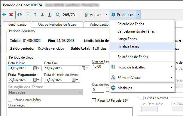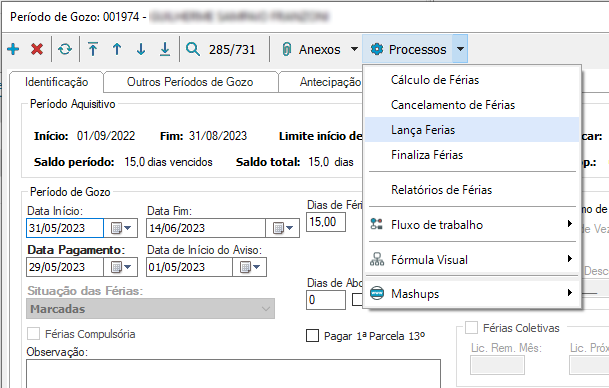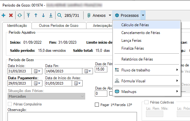 Através deste processo são calculadas as férias que foram previamente cadastradas no mês e/ou próximos meses, ou calculado apenas o abono pecuniário cadastrado sem o gozo das férias.