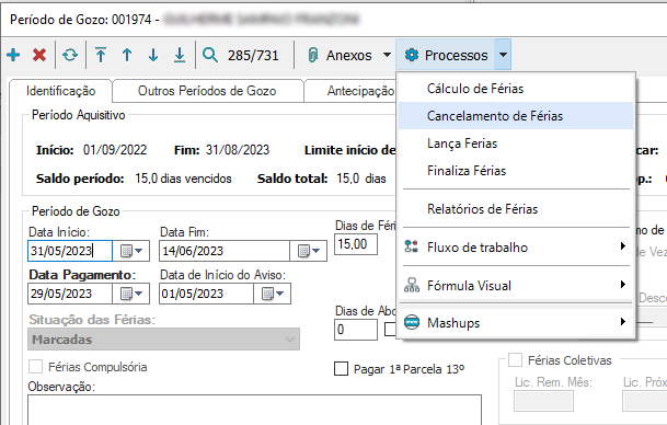 O cancelamento das férias acontece através da opção “Processos- Cancelamento de Férias”