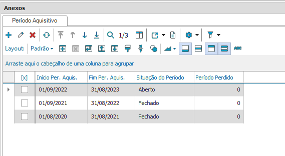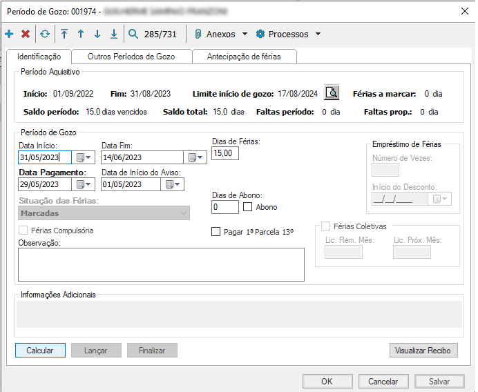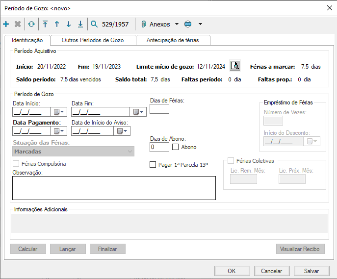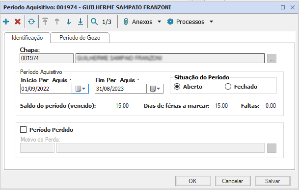 Período Aquisitivo: Apresenta as informações referentes ao período aquisitivo do colaborador (Início, fim, Saldo, etc.);