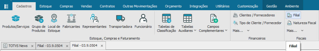 O cadastro de filiais é feito em “Módulo BackOffice- Gestão de Estoque, Compras e Faturamento” aba “Cadastros”