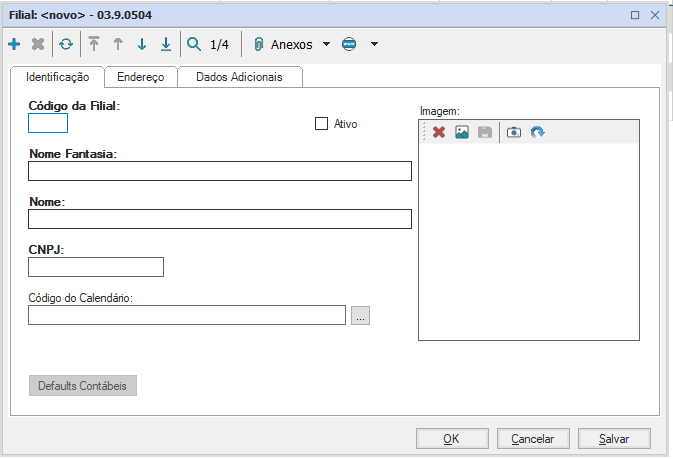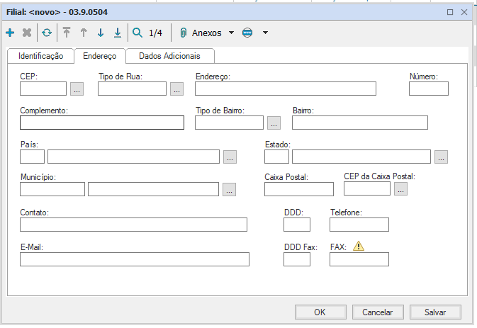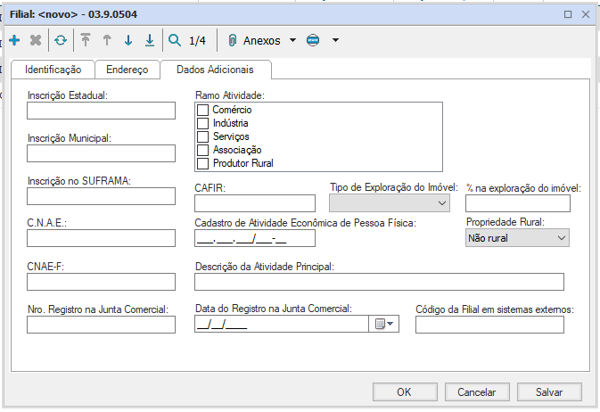 Será exibida uma janela de cadastro com 3 abas, sendo a primeira solicitando informações para Identificação da nova filial, a segunda aba solicitando o Endereço e a última aba solicitando Dados Adicionais, como números de registros diversos e o ramo da atividade: