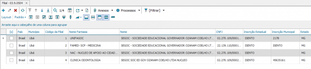 Ao acessar o menu, será exibida uma tela contendo as filiais cadastradas anteriormente e algumas informações referentes a elas.