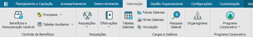Os cadastros apresentados a seguir estão localizados no “Módulo RH- Gestão de Pessoas” aba “Valorização”