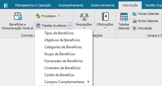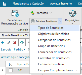 Antes de efetuar o cadastro de Benefícios é preciso cadastrar previamente alguns tópicos localizados em “Tabelas Auxiliares”