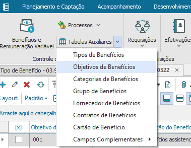 É o cadastro onde são definidos os objetivos dos benefícios cadastrados. Para realizar o cadastro selecione “Objetivos de Benefícios” na opção “Tabelas Auxiliares”
