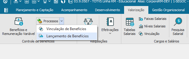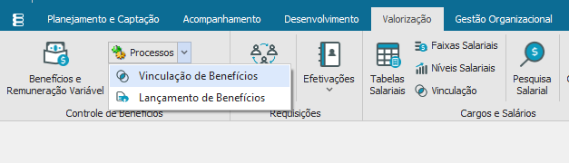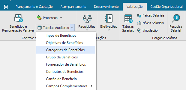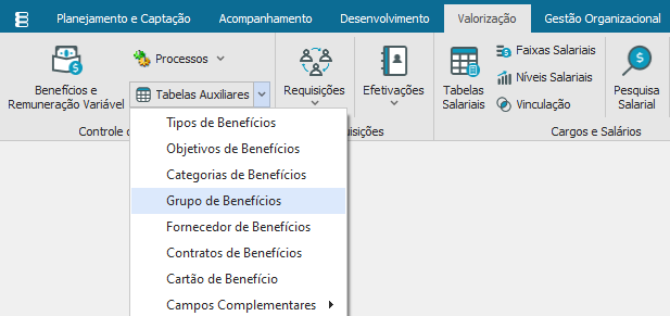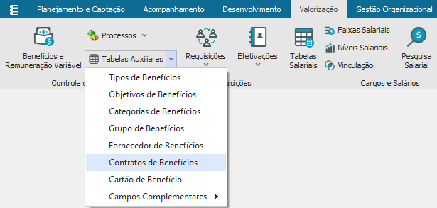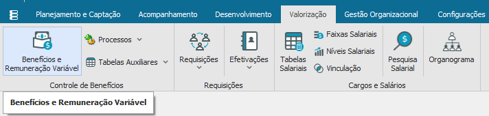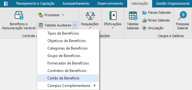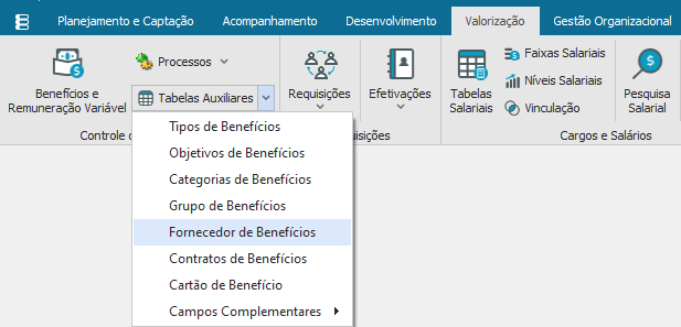 O cadastro tem como objetivo definir os Benefícios concedidos pela empresa aos seus funcionários. Para realizar o cadastro selecione “Benefícios e Remuneração Variável” na aba “Valorização”
