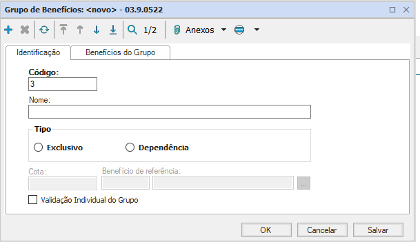 – O campo “Benefício de Referência” será habilitado quando o tipo do grupo escolhido for de “Dependência” sendo necessário vincular um benefício a outro.