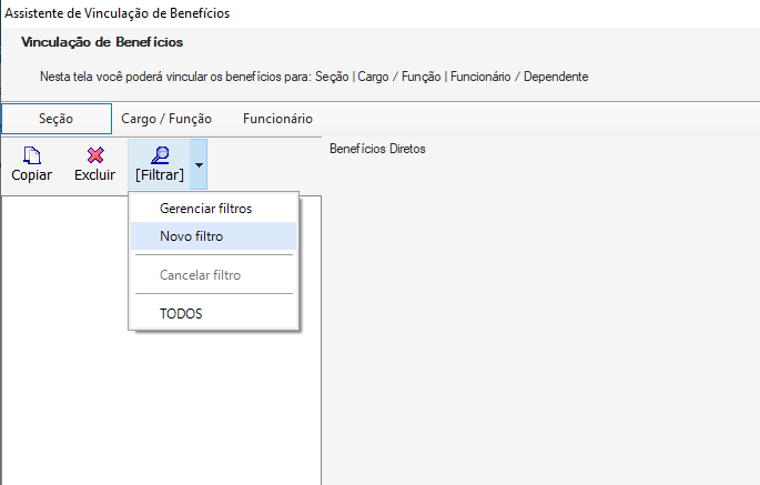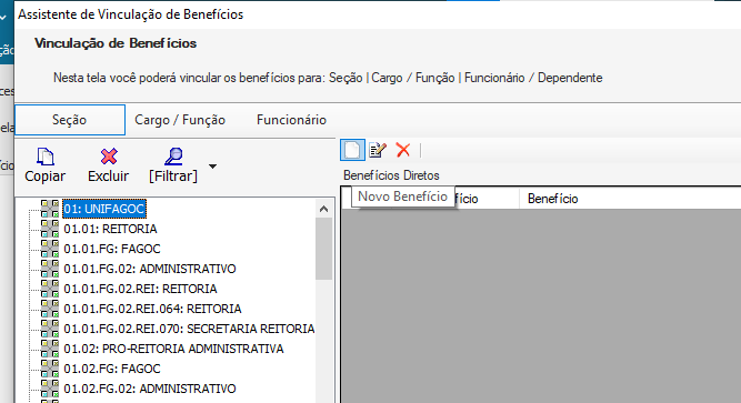 Após selecionar o tipo de vinculação e o filtro, inclua o benefício a seção, cargo/ função ou funcionário(s) escolhido