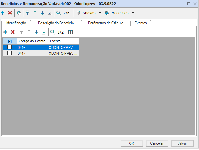 Na aba “Eventos” é onde é feita a vinculação do evento relacionado ao benefício que está sendo cadastrado. Para realizar essa ação clique em “incluir”, selecione o respectivo evento, e em seguida clique em “Salvar”