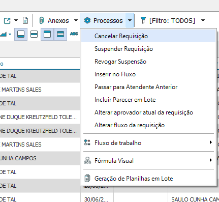 - Observação: Na opção “Processos” existe a possibilidade de realizar o cancelamento e a suspensão de determinada requisição