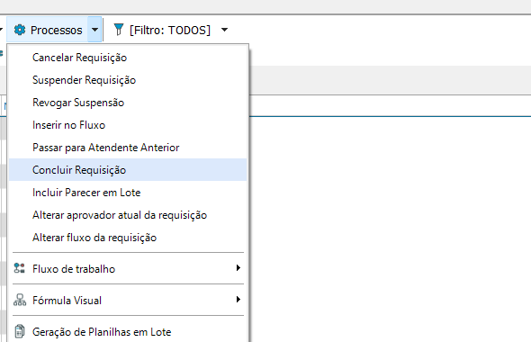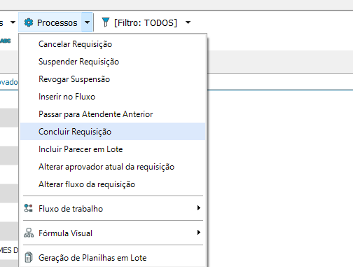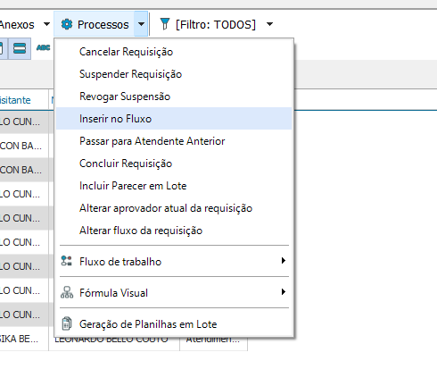 Logo após a realização do cadastro, é necessário incluir a requisição no fluxo de aprovação. Para realizar essa ação, selecione a requisição desejada e em seguida clique em “Processos- Inserir no Fluxo”