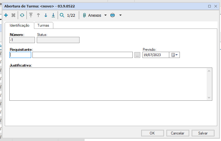 A requisição de abertura de turmas tem como objetivo efetivar as turmas propostas, para isso é necessário realizar a inserção manual da requisição solicitada via sistema de Demandas no sistema Totvs RM. Para efetuar o processo, selecione “Requisições- Requisição de Abertura de Turmas”