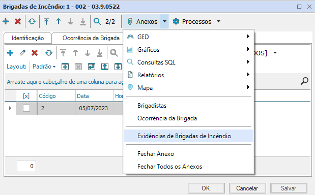- Para incluir alguma evidência, após concluir a ocorrência da brigada, selecione a opção “Anexos- Evidências de Brigada de Incêndio”