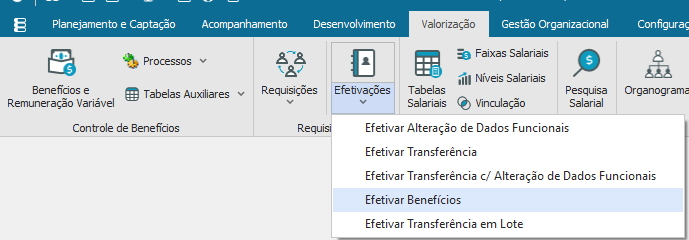 Após a “aprovação” da requisição é necessário realizar a efetivação do benefício. Para isso, selecione a aba “Valorização” e escolha a opção “Efetivações- Efetivar Benefícios”