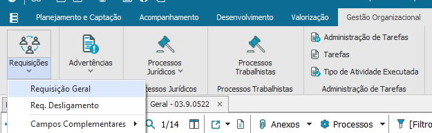Para acompanhar o fluxo de aprovação da requisição entre no “Módulo RH- Gestão de Pessoas” em seguida, escolha a aba “Gestão Organizacional” opção “Requisições- Requisição Geral”