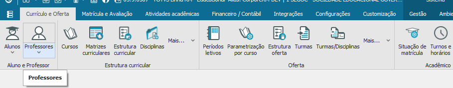 O cadastro de professores fica localizado no “Módulo Educacional” aba “Currículo e Oferta” opção “Professores”