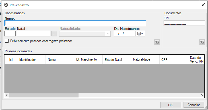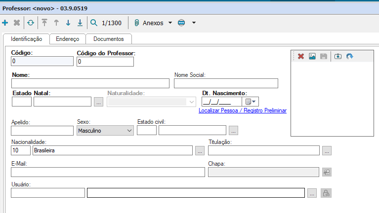 O botão “Localizar Pessoa/Registro Preliminar”, abaixo da data de nascimento, é um verificador de cadastro. Ao cadastrar um professor, para verificar se ele já possui cadastro, é possível pesquisar nesse local e, caso já exista um cadastro de pessoa, é possível aproveitar as informações disponíveis e importar para o cadastro do professor o seu pré-cadastro