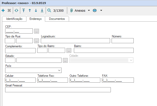 O cadastro de professor apresenta abas superiores e inferiores, sendo elas: