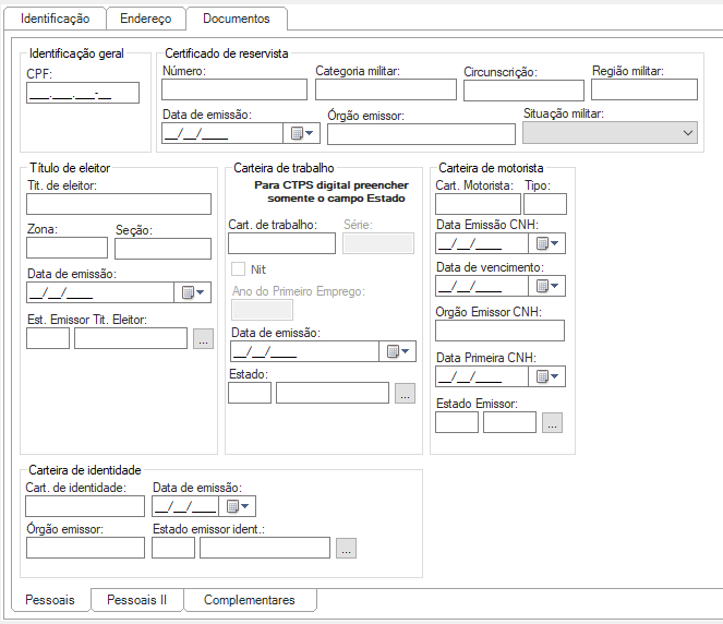 A aba “Documentos” possui três abas inferiores, preencha os dados e clique em “salvar” após preencher cada aba