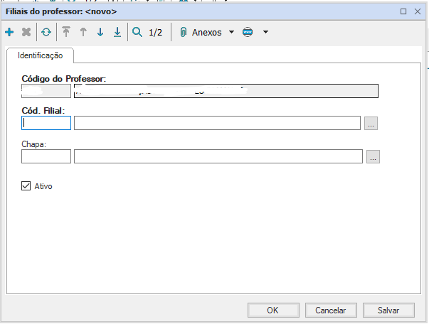 Um detalhe importante referente a Filias do Professor é a ativação e desativação do professor pelo campo “Ativo”