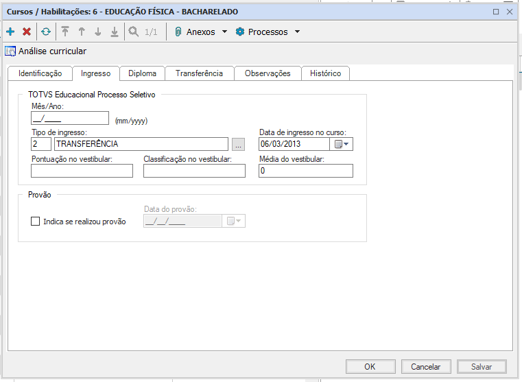 O tipo de ingresso e a data de ingresso do aluno são informações obrigatórias para o Censo. É necessário acessar, nos anexos do cadastro do aluno, o item “Cursos / Habilitações”. Dentro do cadastro do curso deve-se acessar a aba “Ingresso” devem ser informados o Mês/Ano de ingresso, o tipo de ingresso e a data de ingresso no curso. Caso o tipo de ingresso não esteja cadastrado, o sistema coloca automaticamente que esse ingresso ocorreu por vestibular.