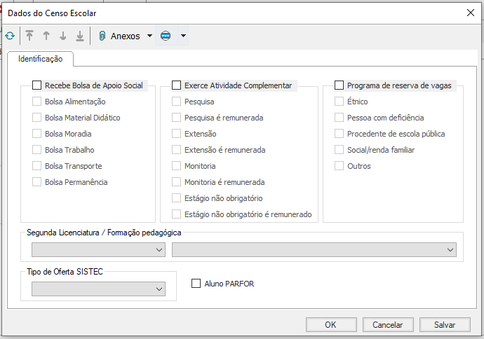 Caso o aluno conte com algum auxílio ou exerça alguma atividade complementar, essa informação deverá ser fornecida na aba Anexos > Dados do curso do aluno para o Censo Escolar, no cadastro de Cursos/ Habilitações.