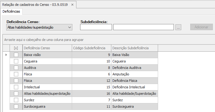 No campo de seleção das deficiências do Censo estão listadas todas as deficiências atualmente presentes no cadastro do Censo e no campo de Subdeficiências é possível selecionar as deficiências cadastradas no cadastro de deficiências do Educacional. Após fazer a relação, é só adicionar e seguir fazendo a relação.