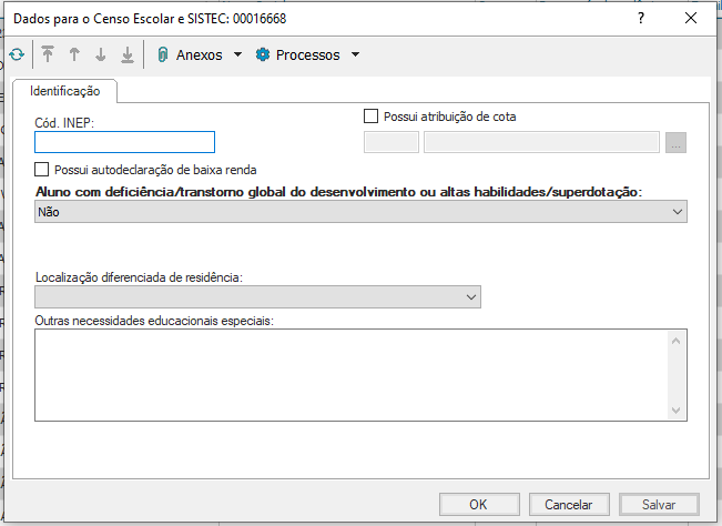 Ao acessar Anexos > Dados para o Censo Escolar e SISTEC são visualizados os datos solicitados pelo MEC no questionário “Dados do Aluno”. Essa área deve ser utilizada para correção do código do INEP atribuído ao aluno. Esse campo é preenchido automaticamente no processo de importação do arquivo gerado pelo MEC.