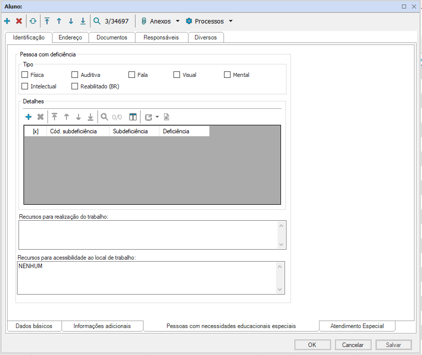 Ainda nos cadastros dos alunos, na aba superior “Identificação” e inferior “Pessoas com necessidades educacionais especiais”, é necessário informar a(s) deficiência(s) do aluno e, na área “Detalhes”, informar a subdeficiência conforme registrado na relação de cadastros do Censo.