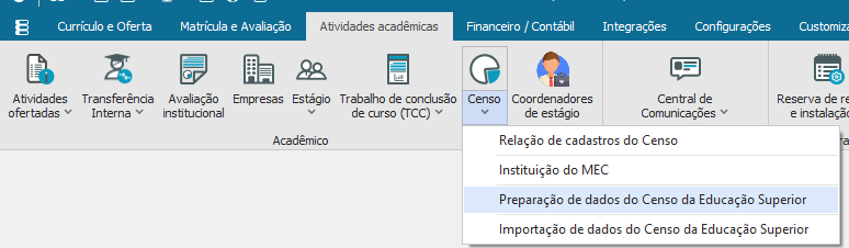 Depois de realizar todas as verificações dos cadastros demonstrados acima, selecione na aba “Atividades Acadêmicas” a opção “Preparação dados para o Censo do Ensino Superior”