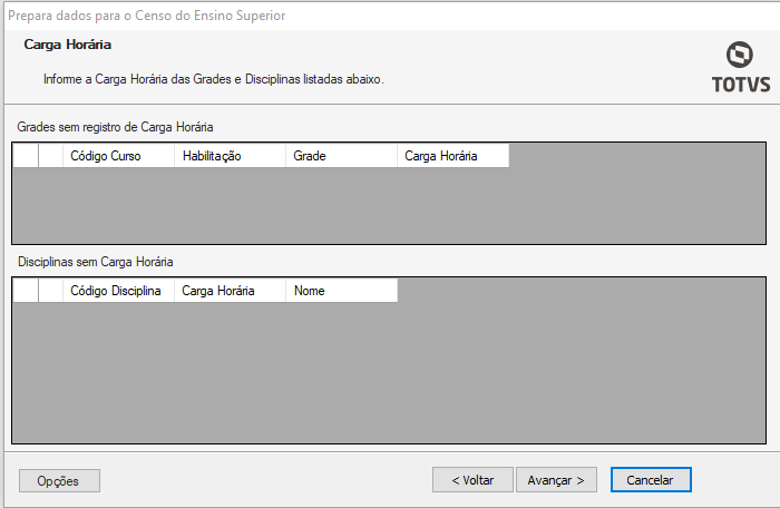 Logo após, informe a carga horária das grades e disciplinas que aparecerão na próxima aba