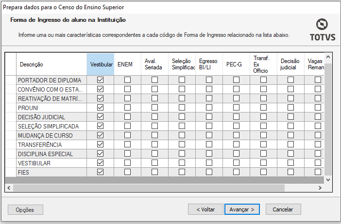 Após informar o código, clique em “avançar” e selecione as formas de ingresso na instituição