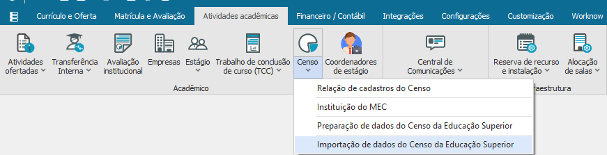 Para realizar a importação dos dados do Censo é necessário escolhera opção “Censo- Importação de Dados do Censo da Educação Superior”