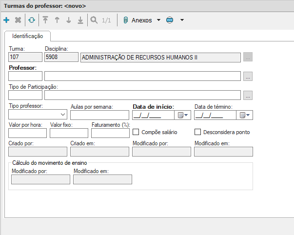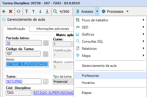 Depois de preencher as informações referentes a aba “Identificação” é necessário realizar a vinculação dos professores ao cadastro de Turmas/Disciplinas. Para realizar essa ação, selecione a opção “Anexos- Professores”
