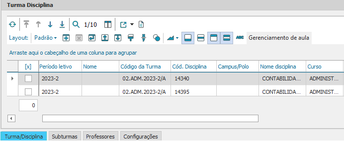 Após selecionar o filtro de turma, clique na aba “Turma / Disciplina” no canto inferior esquerdo, para que possa abrir a aba de disciplinas desse determinado período e curso.
