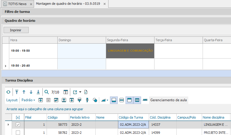 Em seguida, selecione a disciplina desejada e arraste a mesma para o quadro de horário, definindo o dia e o horário de cada disciplina para determinada turma