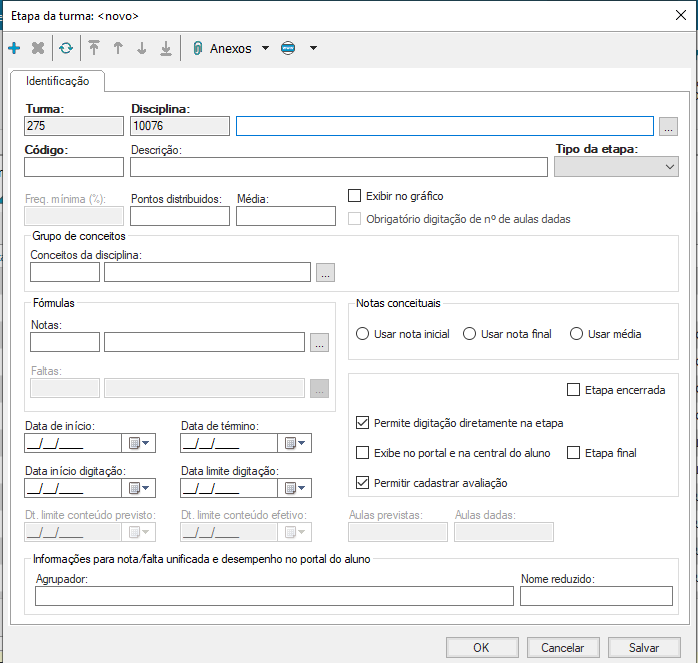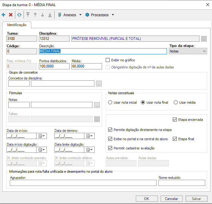 Descrição: Dê uma breve descrição do tipo da etapa (ex. Média final e total de faltas.);