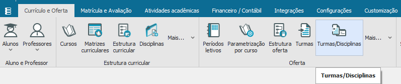 O cadastro tem como objetivo a realização do cadastro de turma/disciplinas em lote para um conjunto de turmas selecionadas. Para realizar o cadastro selecione a opção “Turmas/ Disciplinas” na aba “Currículo e Oferta”