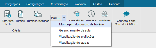 O Quadro de horários consiste na exibição e cadastro dos horários de cada disciplina semanal. Para realizar a montagem de um quadro de horário seleciona na aba “Currículo e Oferta” na opção “Montagem do Quadro de Horário”