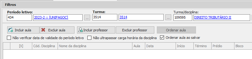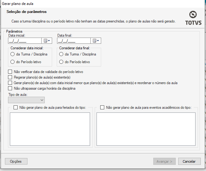 Não verificar data de validade do período letivo: habilite a opção caso seja necessário gerar um plano de aula fora da data de validade do período letivo;