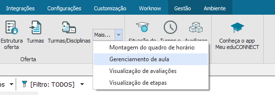 Após selecionar a opção acima informe o período letivo, turma e turma disciplina e realize o gerenciamento das aulas