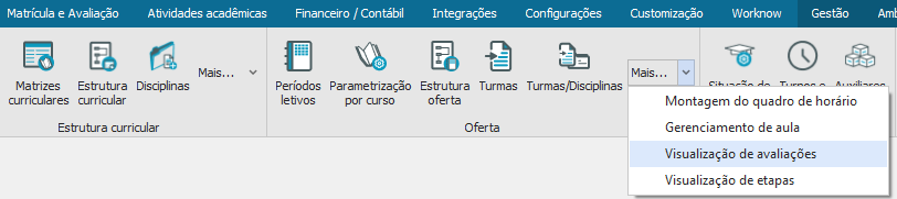 Através dessa opção é possível visualizar e alterar as avaliações por curso já cadastradas. Para realizar essa visualização escolha na aba “Currículo e Oferta” a opção “Visualização de Avaliações”